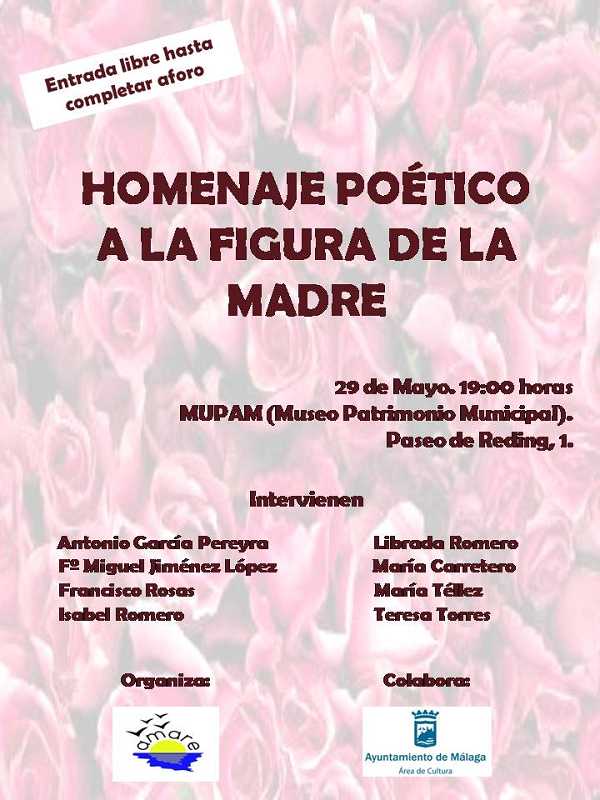 La Asociación Malagueña de Artritis Reumatoide (AMARE) organiza el evento "Homenaje poético a la figura de la madre", que tendrá lugaren el MUPAM (Museo del Patrimonio Municipal), sito en Paseo Reding, 1, y contaremos con: